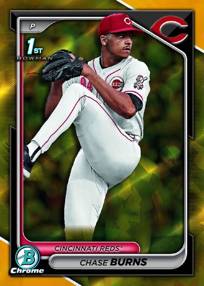 The Sapphire parallel rainbow offers six numbered tiers that combine to land three per box, creating consistent color variety throughout the breaking experience. Standard Sapphire Chrome cards establish the foundation with their signature blue borders and chromium sparkle, followed by Yellow Sapphire limited to 75 copies that appear approximately once every six packs. The hierarchy continues with Gold Sapphire numbered to just 50 copies (1:9 packs), Orange Sapphire at 25 copies (1:17 packs), and the ultra-scarce Black Sapphire limited to only 10 examples per card (1:43 packs). Red Sapphire elevates the pursuit further with just five copies (1:85 packs), while the extraordinary Padparadscha Sapphire 1/1 stands as the ultimate rainbow chase appearing once every 421 packs. Browse 2024 Bowman Draft Sapphire parallels on eBay to discover which color variations are emerging as the most desirable for key prospects like Travis Bazzana, Nick Kurtz, and Jac Caglianone. All parallels maintain the distinctive blue Sapphire aesthetic that makes this product instantly recognizable, with the chromium background pattern creating stunning visual appeal when combined with the various color tiers. The guaranteed three parallels per box ensure that collectors consistently encounter numbered cards, making even the base Sapphire format feel premium compared to traditional Chrome releases.