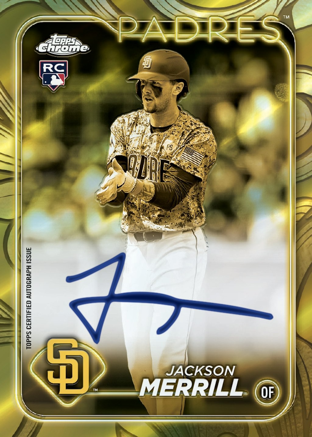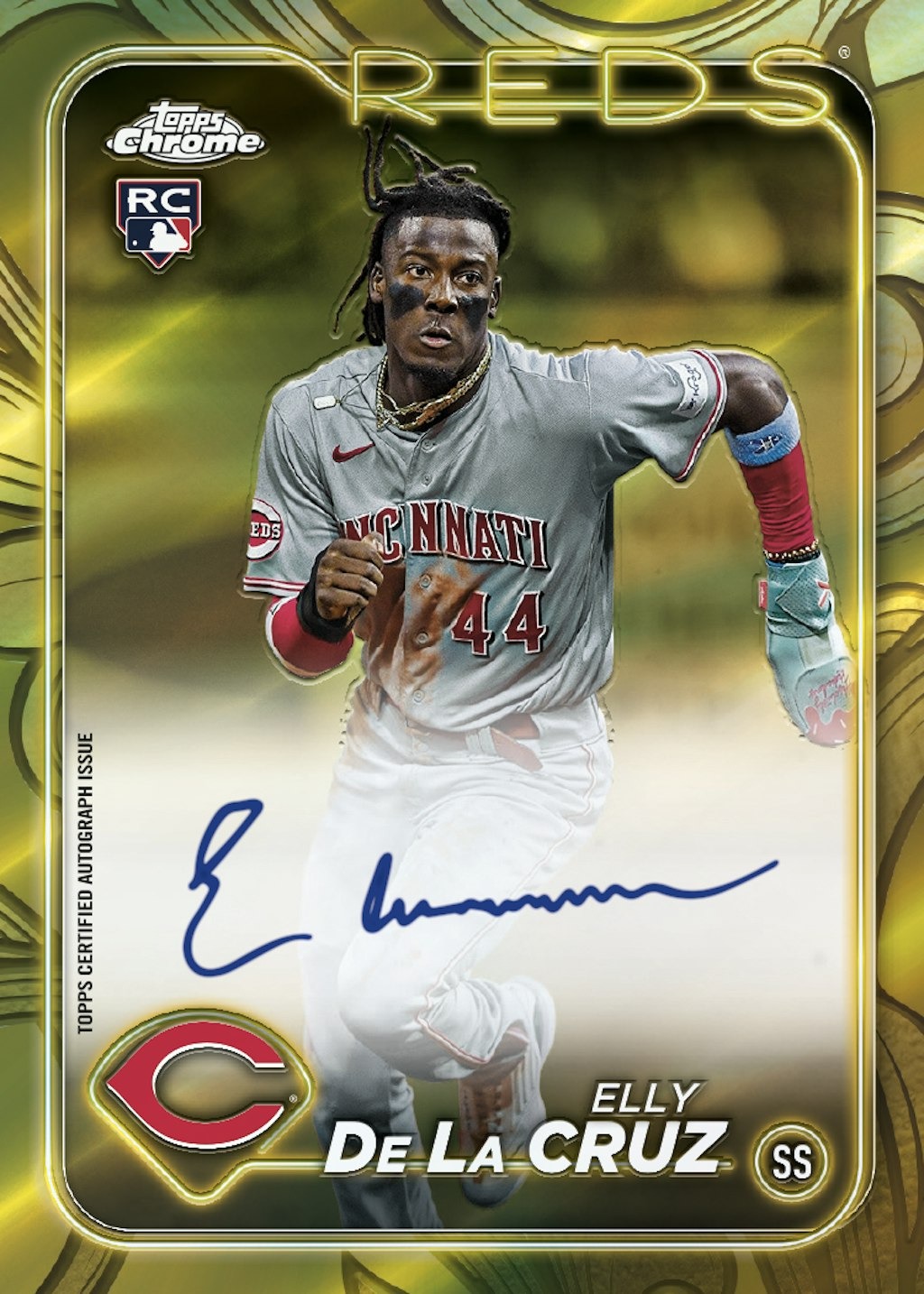 The autograph program in 2024 Topps Gilded Collection Baseball delivers exceptional value with two guaranteed signatures per five-card box, including one metal-framed autograph or cut signature that serves as the box's premium centerpiece. Topps Chrome Gold Autographs upgrade the base set design with on-card signatures numbered to 99 copies, providing an accessible entry point into the autograph hierarchy with a parallel rainbow featuring Yellow/Gold (/75), Blue/Gold (/50), Rose Gold/Gold (/25), Red/Gold (/5), and Superfractor 1/1 versions. The checklist for Chrome Gold Autographs balances Hall of Famers like Derek Jeter, Albert Pujols, Ichiro, and Frank Thomas with emerging stars like Colton Cowser, Elly De La Cruz, Junior Caminero, and Jordan Lawlar, creating broad collector appeal across multiple collecting segments.