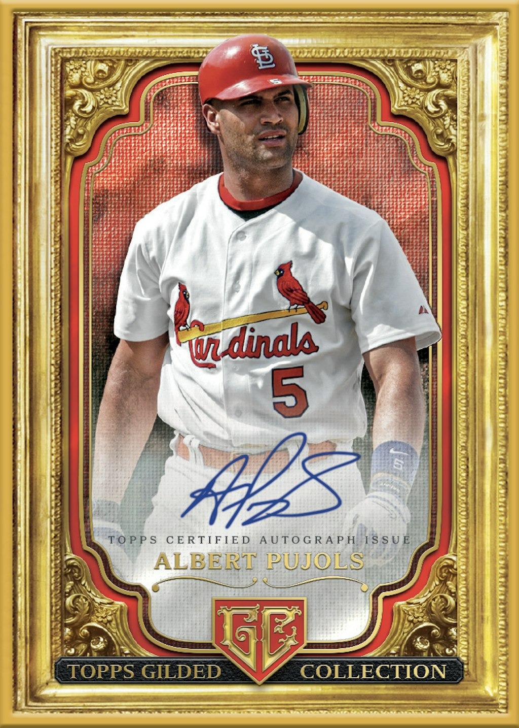 Gold Framed Hall of Famers Autographs deliver Cooperstown inductees with distinctive metal-frame presentation, numbered to 99 copies with Rose Gold (/50), Emerald (/25), Onyx (/10), Ruby (/5), and Platinum 1/1 parallels that create extensive rainbow-chasing opportunities. A new batch of Gilded Hall of Fame Plaque Autographs returns with plaque designs numbered to 25 copies and Onyx (/10), Ruby (/5), and Platinum 1/1 parallels. Gilded Champions Autographs celebrate World Series champions with cards numbered to 50 copies and Emerald (/25), Onyx (/10), Ruby (/5), and Platinum 1/1 versions. Topps Gallery of Gold Autographs round out the signature content with 50-copy print runs and four parallel tiers. Collectors hunting specific signed cards can find 2024 Topps Gilded Collection autographs on eBay, where the market for metal-framed Hall of Famers and low-numbered parallels drives significant activity.