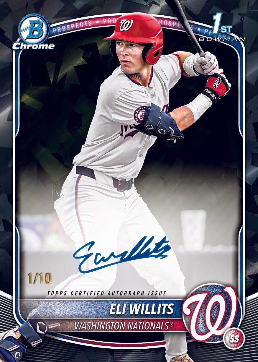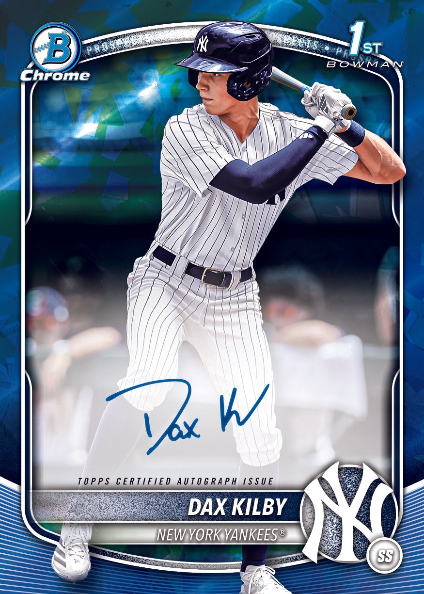 The autograph program for 2025 Bowman Draft Sapphire Baseball centers on Chrome Prospect Autographs, which feature the top selections from the MLB Draft with blue flourishes that complement the Sapphire aesthetic while delivering on-card signatures from the next generation of MLB stars. The checklist features 30 prospects including Billy Carlson from the Chicago White Sox, Brandon Compton from the Miami Marlins, Brady Ebel from the Milwaukee Brewers, Caden Bodene from the Baltimore Orioles, Charles Davalan from the Los Angeles Dodgers, and Dax Kilby from the New York Yankees - all representing the future of their respective franchises. Additional signers include Ethan Conrad and Kane Kepley from the Chicago Cubs, Ethan Petry and Eli Willits from the Washington Nationals, Gavin Fien from the Texas Rangers, Gavin Kilen from the San Francisco Giants, Gage Wood from the Philadelphia Phillies, and Josh Hammond from the Kansas City Royals. The autograph parallel rainbow mirrors the base set with Green Sapphire numbered to 99, Gold Sapphire numbered to 50, Orange Sapphire limited to 25, Black Sapphire numbered to 10, Red Sapphire limited to just five, and Padparadscha Sapphire 1/1 parallels that create true masterpieces for team collectors and prospectors. Find 2025 Bowman Draft Sapphire autographs on eBay from your favorite team's top prospects. The hobby box guarantee of one autograph ensures every box delivers a prospect signature, while the numbered parallel rainbow creates serious chase potential for collectors pursuing complete autograph rainbows of their favorite players.