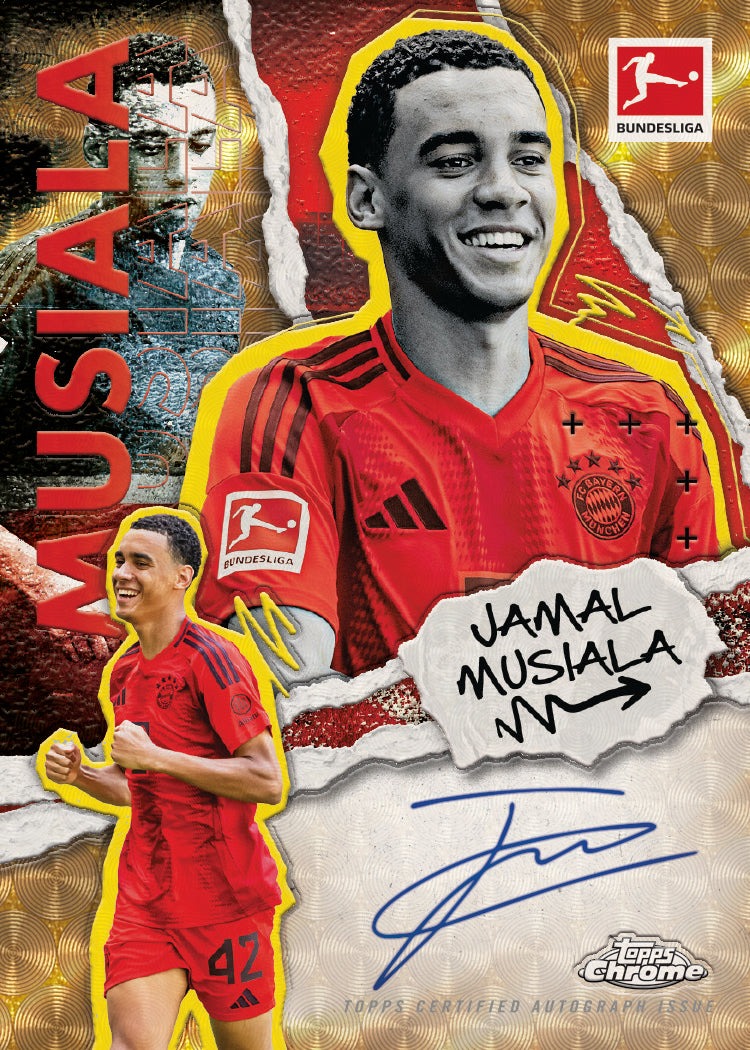 Autograph content flows generously through 2024-25 Topps Chrome Bundesliga with one guaranteed signature per hobby box and a comprehensive autograph lineup that spans rookies, veterans, and legends across multiple themed sets. The base autograph set carries over the iconic Chrome design with 14 Refractor parallels that mirror the base set structure, beginning with Green Refractor and Green Lava Refractor at 99 copies and progressing through Yellow Refractor and Yellow Lava Refractor at 75, the special Toppsfractor at 52 copies honoring the Bundesliga season, Gold Refractor and Gold Lava Refractor at 50, Orange Refractor and Orange Lava Refractor at 25, Black Refractor and Black Lava Refractor at 10, Red Refractor and Red Lava Refractor at 5, before culminating in the coveted 1/1 Superfractor. Dual autographs return with Gold Refractor (/50), Orange Refractor (/25), Black Refractor (/10), Red Refractor (/5), and Superfractor (1/1) parallels that create exceptional value by pairing multiple players on single cards. Triple autographs offer even more impressive combinations with Black Refractor (/10), Red Refractor (/5), and Superfractor (1/1) versions that bring together three distinct signatures on premium Chrome stock. The autograph lineup expands through multiple themed insert sets including History is Now Dual Autographs, Ultrabeam Autographs with stunning background designs, BUZZ Autographs that carry over the energetic insert theme, Verve! Autographs showcasing dynamic player action, and First Taste Autographs focusing on debut signatures from the league's newest stars. First Taste Autographs feature Red Refractor (/5) and Superfractor (1/1) parallels that create premium chase options for prospect collectors. The ultimate autograph chase arrives via three special edition 1/1 cards that honor German football greatness: Der Kaiser featuring legendary Franz Beckenbauer celebrating his iconic nickname, Der Musiala showcasing Bayern Munich superstar Jamal Musiala, and Der Wirtz highlighting Bayer Leverkusen star Florian Wirtz. Notable signers span the league's biggest names including Harry Kane, Joshua Kimmich, Jamal Musiala, Florian Wirtz, Xavi Simons, Loïs Openda, Serhou Guirassy, and rising talents like Tom Bischof, Nelson Weiper, and Max Moerstedt—creating autograph content that appeals to collectors of every preference from established veteran collectors to prospect-focused enthusiasts chasing the next generation of Bundesliga superstars.
