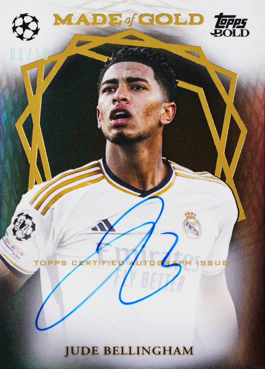 The parallel rainbow structures across Definitive Collection's autograph sets create extensive numbered chase opportunities spanning multiple scarcity tiers. Marks of Excellence autographs serve as the product's foundational signature set, offering five numbered parallels beginning with Gold Foilboard numbered to 50 copies as the accessible entry point, followed by Orange Foilboard at 25 copies that introduces moderate rarity. Purple Foilboard parallels limited to 10 numbered versions escalate difficulty substantially, while Red Foilboard variants numbered to just five copies represent ultra-scarce chase content that demands significant secondary market premiums. The ultimate Marks of Excellence chase arrives through Foilfractor 1/1 variants, representing the product's most spectacular base autograph versions with unique chromium treatments that transform standard signatures into legendary status within the collection hierarchy. Browse 2024-25 Topps Definitive Collection UEFA parallels on eBay to discover which variations command the strongest premiums for superstars like Erling Haaland, Lamine Yamal, and Jude Bellingham. Definitive Rookie Autographs feature four-tier parallel structures with Black numbered to 15 copies serving as the most accessible variation, followed by Green at 10 copies, Purple at five copies, and Red 1/1 variants representing the ultimate rookie autograph chase. Defining Images Autograph Collection offers Green parallels numbered to 10 copies, Purple at five copies, and Red 1/1 versions, while Legendary Autographs and Definitive Historic Champions Autographs both include Purple /5 and Red 1/1 parallels that create premium chase content for retired icons. The specialized Bellingham Made of Gold Autographs set celebrates his 2023 Golden Boy award with six parallel tiers from base versions numbered to 75 copies through Gold Foilboard /50, Orange /25, Purple /15, Black /10, Red /5, and culminating in Foilfractor 1/1 variants that represent the ultimate Bellingham chase.
