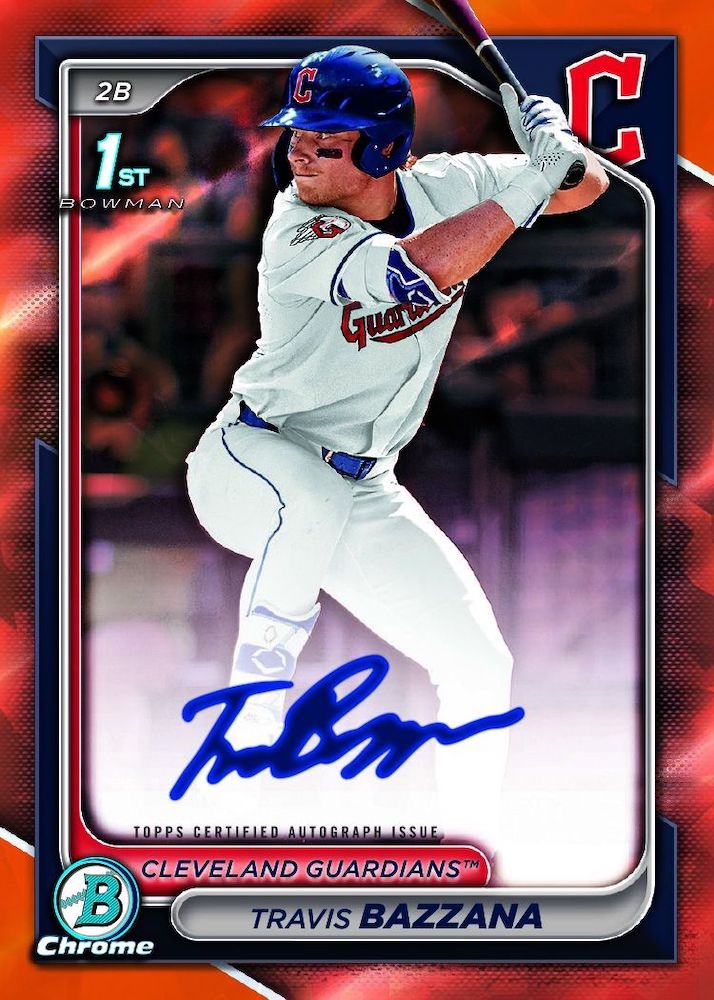 The Sapphire parallel rainbow offers six numbered tiers that combine to land three per box, creating consistent color variety throughout the breaking experience. Standard Sapphire Chrome cards establish the foundation with their signature blue borders and chromium sparkle, followed by Yellow Sapphire limited to 75 copies that appear approximately once every six packs. The hierarchy continues with Gold Sapphire numbered to just 50 copies (1:9 packs), Orange Sapphire at 25 copies (1:17 packs), and the ultra-scarce Black Sapphire limited to only 10 examples per card (1:43 packs). Red Sapphire elevates the pursuit further with just five copies (1:85 packs), while the extraordinary Padparadscha Sapphire 1/1 stands as the ultimate rainbow chase appearing once every 421 packs. Browse 2024 Bowman Draft Sapphire parallels on eBay to discover which color variations are emerging as the most desirable for key prospects like Travis Bazzana, Nick Kurtz, and Jac Caglianone. All parallels maintain the distinctive blue Sapphire aesthetic that makes this product instantly recognizable, with the chromium background pattern creating stunning visual appeal when combined with the various color tiers. The guaranteed three parallels per box ensure that collectors consistently encounter numbered cards, making even the base Sapphire format feel premium compared to traditional Chrome releases.