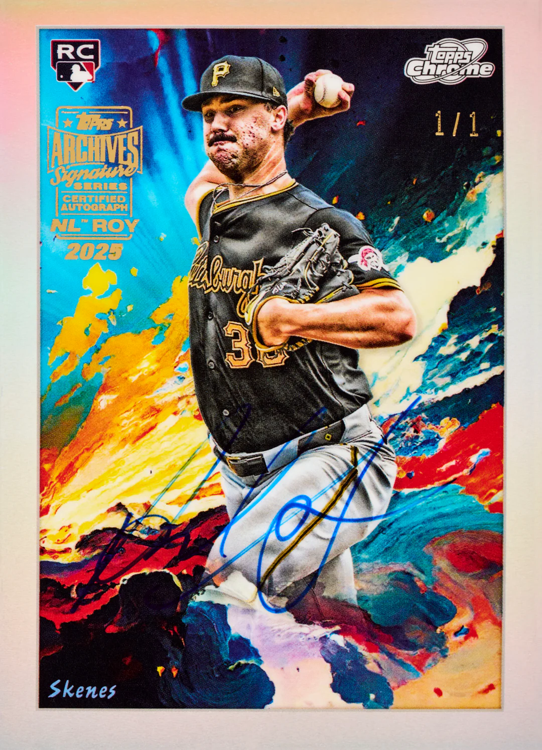 2025 Topps Archives Signature Series Active Player Edition delivers a one-card-per-box experience featuring an encased, on-card buyback autograph from an active MLB player. Released August 6, 2025, the card is gold foil-stamped, serial-numbered to 99 or less, and authenticated.